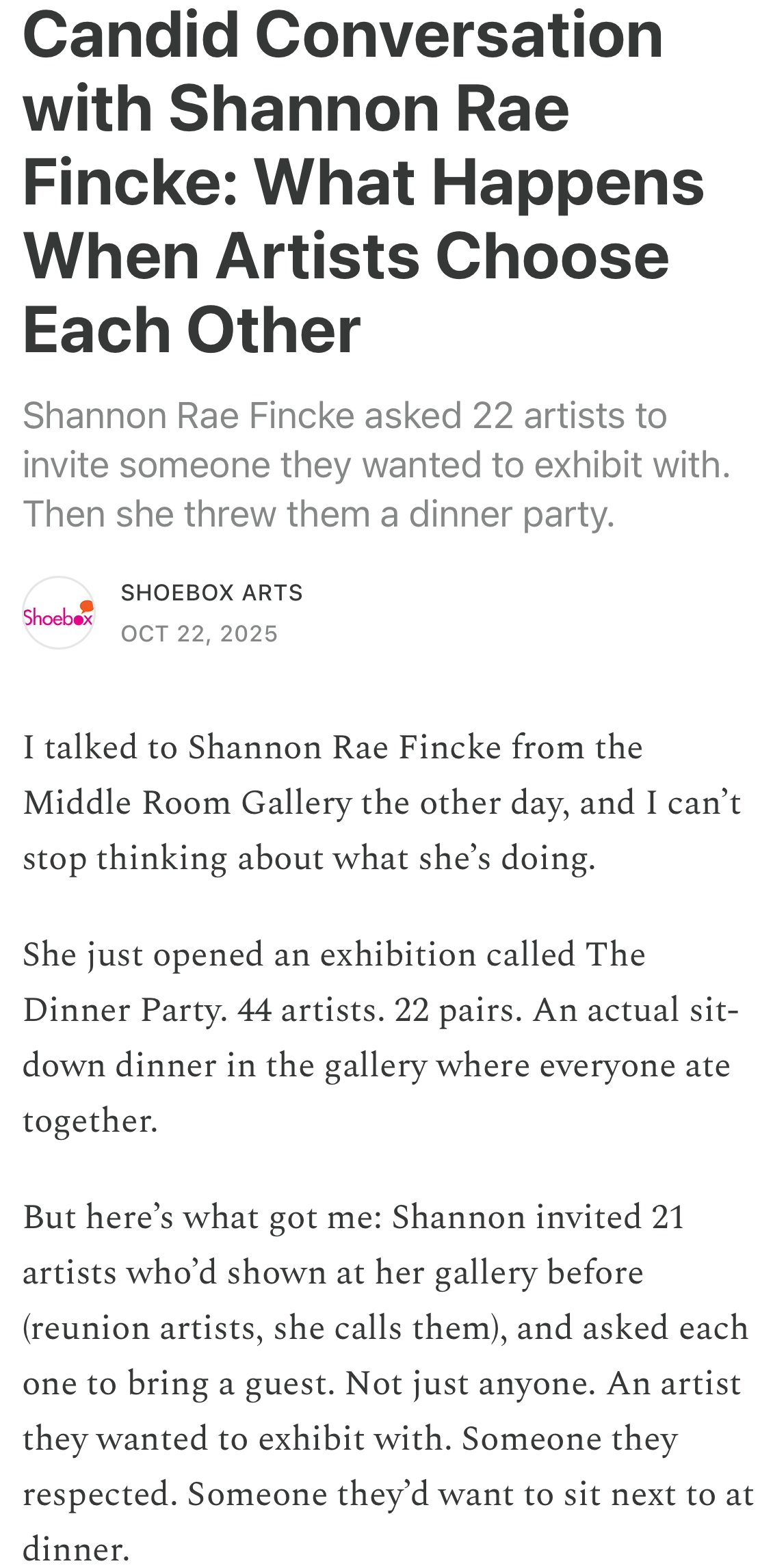 READ MORE PLUS LISTEN TO THE RECORDING OF THE CANDID CONVERSATION BETWEEN SHANNON RAE FINCKE AND KRISTINE SCHOMAKER OF SHOEBOX ARTS ON SUBSTACK