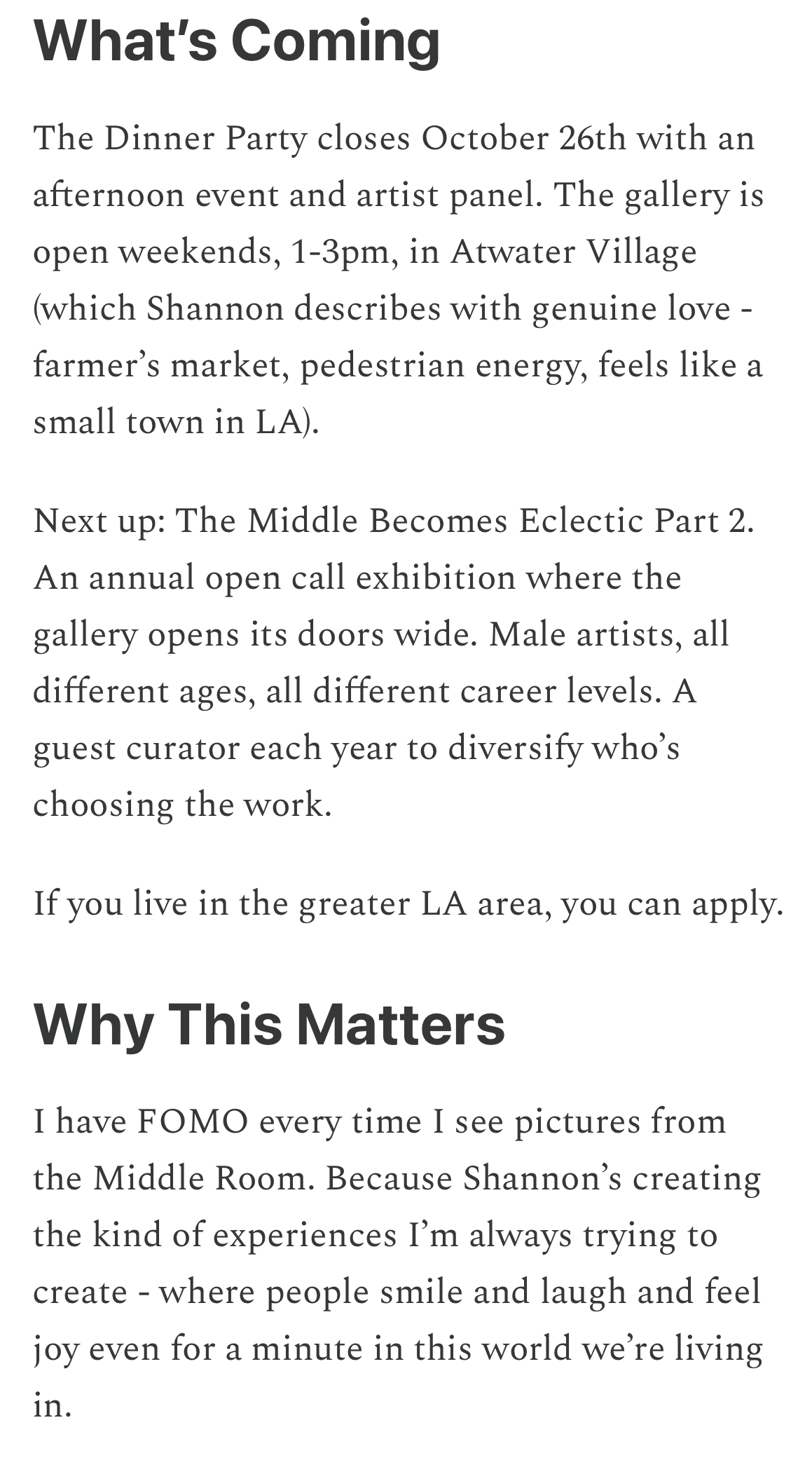 The Middle Room is a contemporary female-focused gallery concentrating on mid-career artists and on creating connections, conversation, and community. Located in the heart of Atwater Village in Los Angeles.